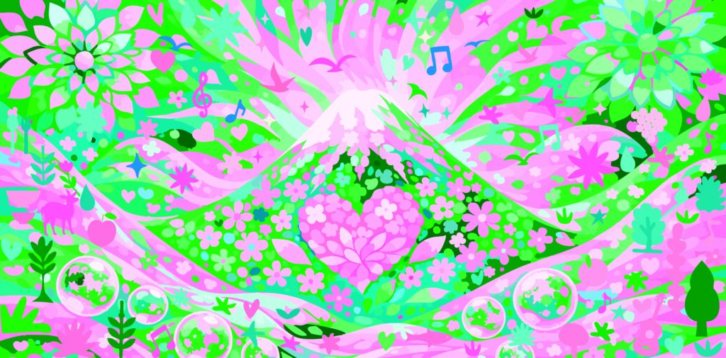 河口湖ステラシアターから望む富士山を象徴的な中心に据え、サステナビューティーフェスから生まれる“ときめき”が、音楽とともに世界へ広がっていく様子を描いています。