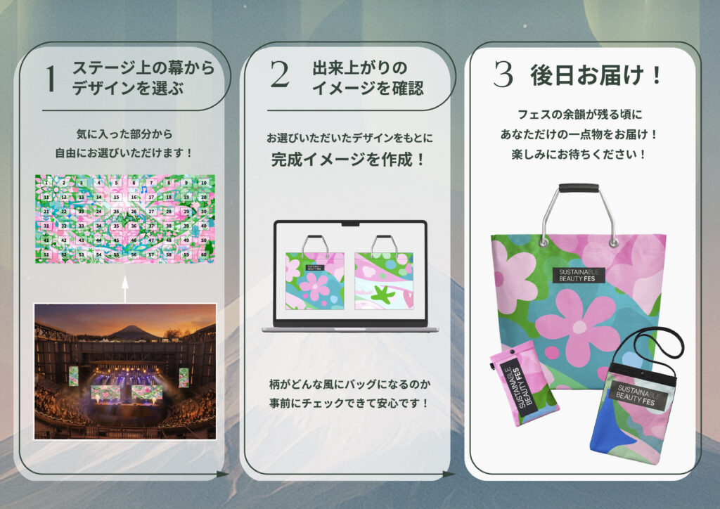 来場者自身がパーツを選び、後日アップサイクルアイテムとしてお届けします。